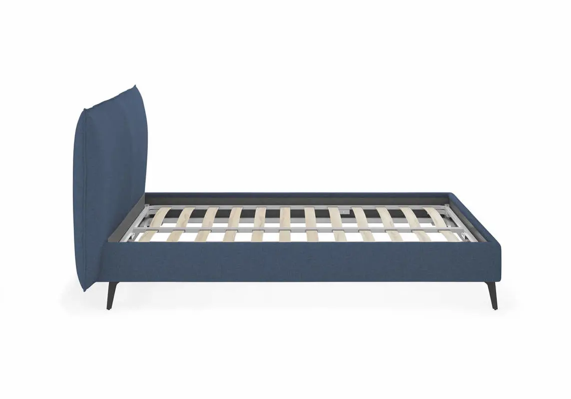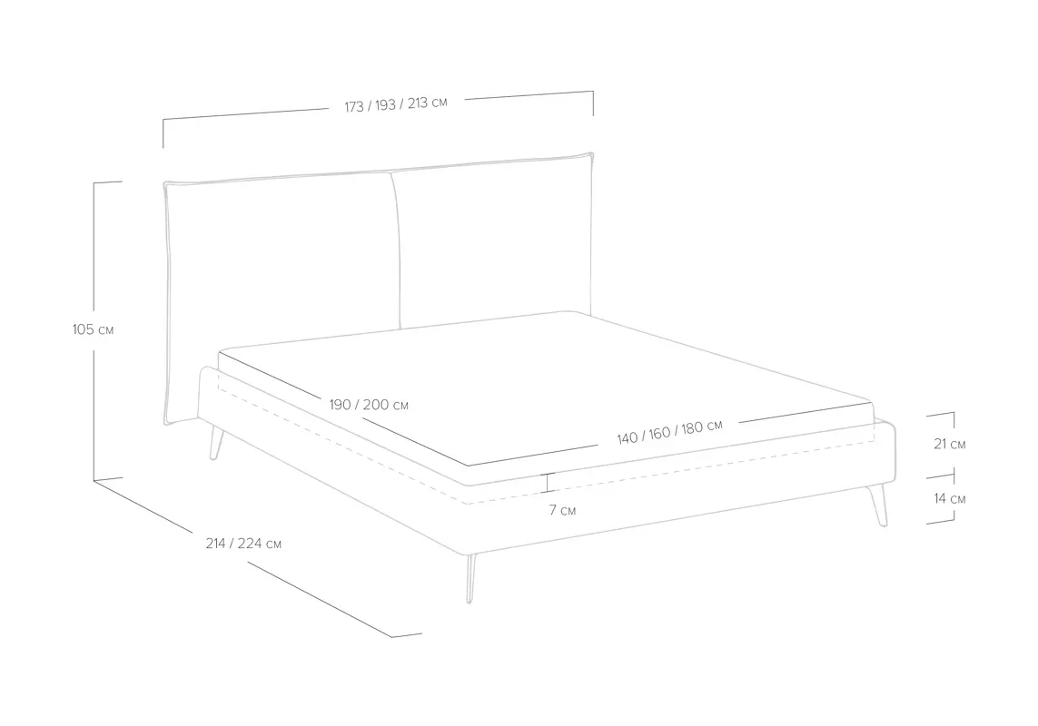 Кровать с мягким изголовьем в виде больших подушек, которые придают спальне особую атмосферу комфорта и уюта. Сзади данная модель полностью обита мебельной тканью, что сохраняет целостность образа и позволяет поставить кровать в центр комнаты. Высокие металлические опоры создают ощущение легкости и изящности, облегчая поддержание чистоты, что делает изделие практичным для повседневного использования.